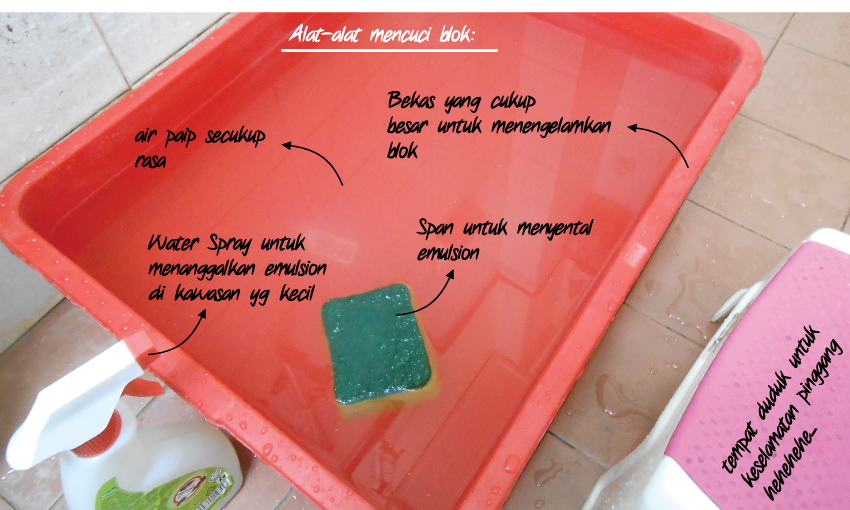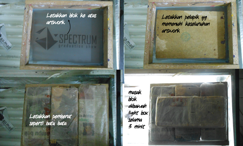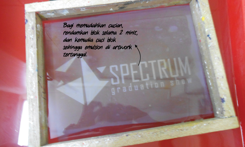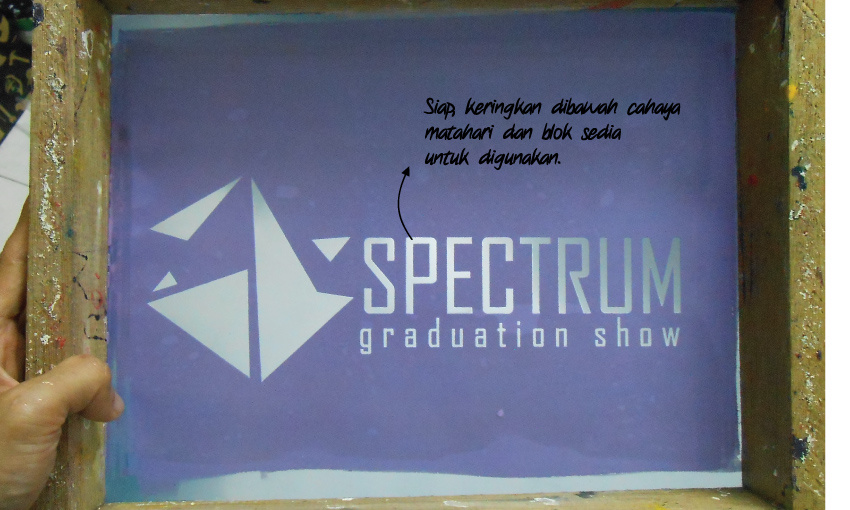 Setelah proses cucian selesai, sila pastikan blok anda betul-betul kering sebelum boleh digunakan untuk proses cetakkan di atas T-shirt. Anda juga perlu menutup bahagian-bahagian yang tidak ditutupi oleh photo emulsion dengan menggunakan clear tape terutamanya di bahagian tepi blok stencil tersebut.