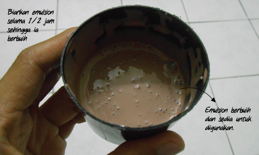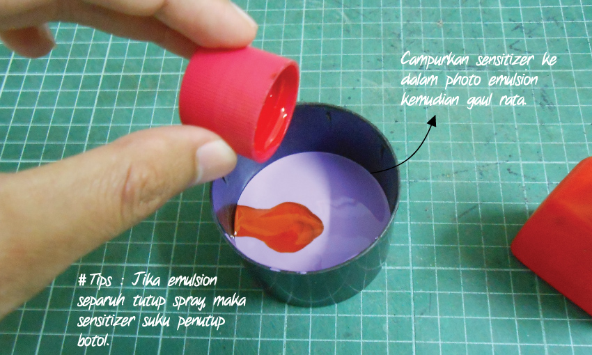 Penyediaan Photo Emulsion perlu dibuat terlebih dahulu dengan mencampurkan sejenis bahan bernama 'synthesizer' yang dibekalkan bersama apabila anda membeli photo emulsion. Pastikan anda menggunakan nisbah yang betul dalam mencampurkan kedua bahan ini.