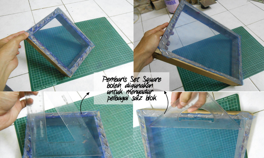 Sediakan peralatan-peralatan seperti di dalam gambar di atas. Ke semua peralatan ini boleh anda beli di kedai pembekal peralatan silk screen seperti Syarikat Hai Kuang di Kuala Lumpur dan Syarikat Khai Lien di Bangi.