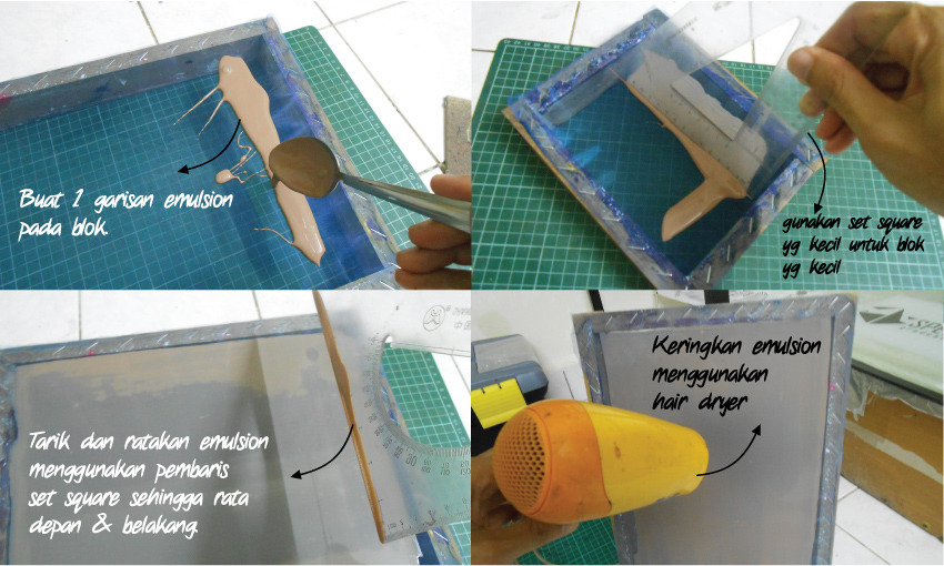 Teknik menyadurkan photo emulsion ke atas blok perlu dilakukan dengan perlahan dan cermat agar photo emulsion menjadi rata serta dapat menutupi kain screen pada blok.