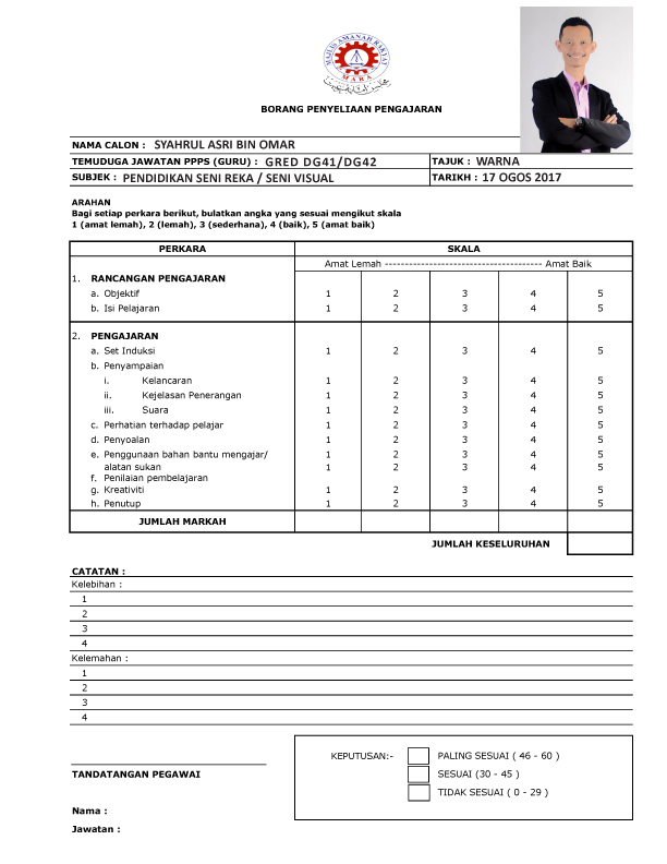 - Sila baca dan teliti borang penilaian temuduga di bawah ini. Secara rasionalnya agak sukar panel untuk menilai anda secara terperinci kerana anda ber lima dalam sesi berkenaan.