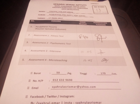 Anda boleh lihat semasa tahun 2013, tiada fitness test yang saya perlu hadapi tetapi ada sesi ujian penulisan esei dalam bahasa inggeris. Oleh kerana pada tahun 2017 subjek yang saya pohon ialah subjek Pendidikan Seni / Visual maka ada ujian melukis perlu saya duduki.