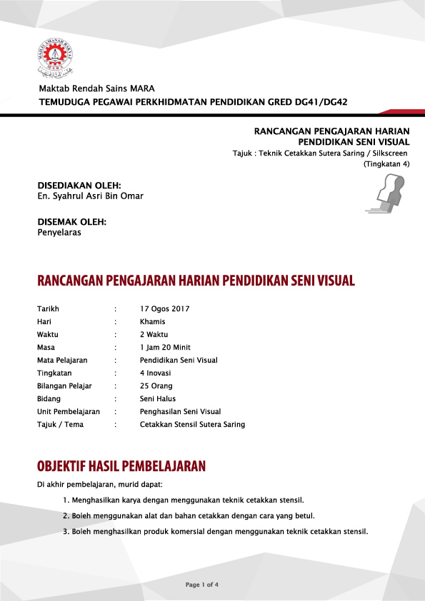 - Rancangan Pengajaran Harian / Teaching Plan / Lesson Plan perlu disediakan dengan kemas dan betul. Biasanya ada 2 panel penemuduga yang terlibat untuk sesi ini. Maka buat lah 2 salinan untuk diberi kepada mereka.
