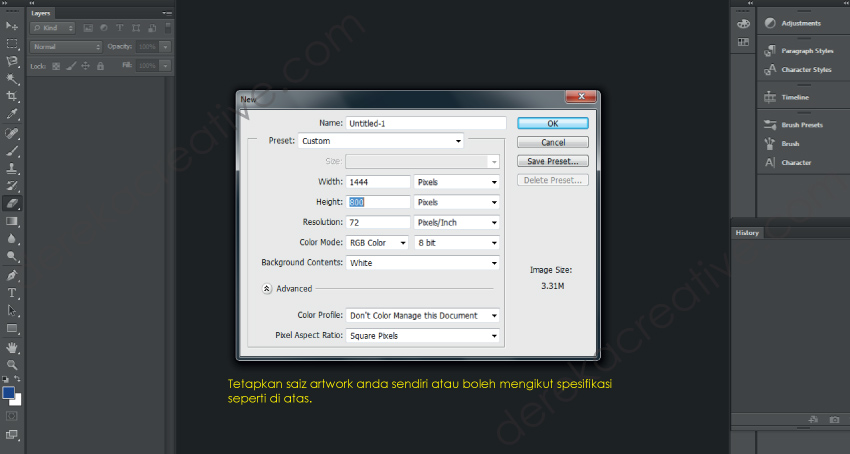 Buka perisian Adobe Photoshop dan setkan dokumen seperti berikut. Anda juga boleh mempelbagaikan saiz dokumen mengikut saiz gambar photo anda sendiri.