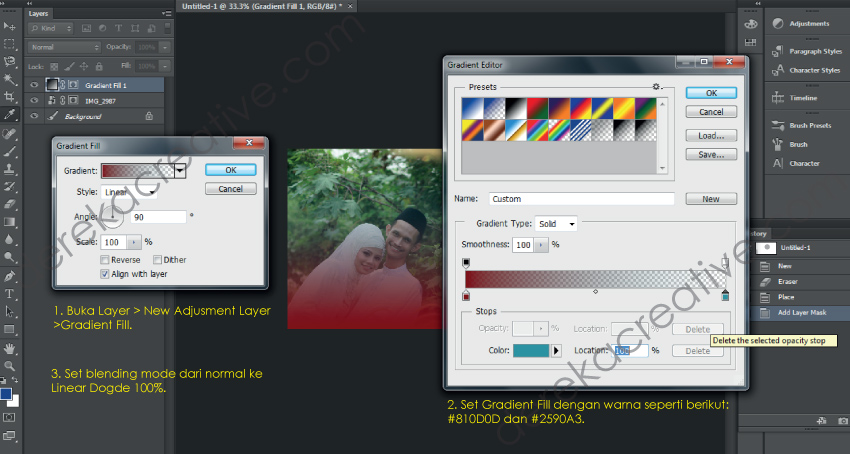 Sila tambahkan gradient seperti yang tertera. Anda juga boleh menggunakan warna lain mengikut kesesuaian gambar photo anda.
