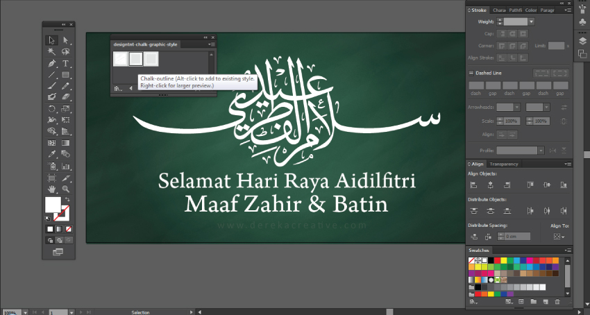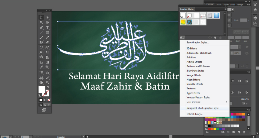 Tutorial pada kali ini ialah merekabentuk ucapan aidilfitri yang ringkas namun mempunyai daya tarikan yang tersendiri. Teknik mudah dan cepat iaitu menggunakan graphic styles chalk board. Selamat mencuba.